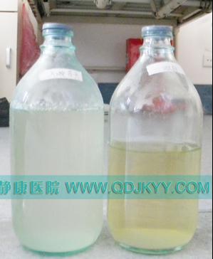 治疗后(右瓶),万平尿液颜色变黄,泡沫减少