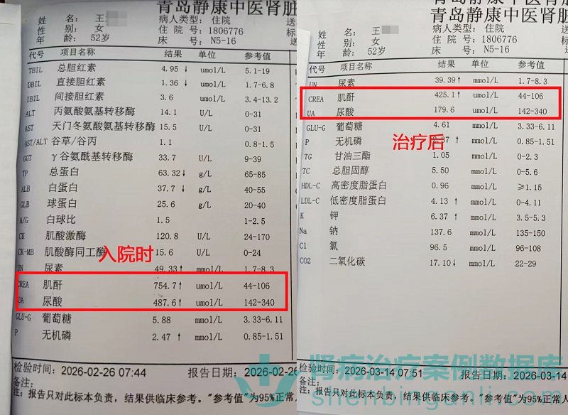 血肌酐最高1592umol/L、一天4次透析,在青岛青岛 中医肾脏病医院
