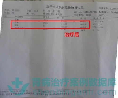 回到家中,叶大叔严格遵医嘱定期服药巩固病情。在当地医院复查结果显示,肌酐值由550umol/L降到了341.8umol/L,尿酸由637.01umol/L降到了130.2umol/L。