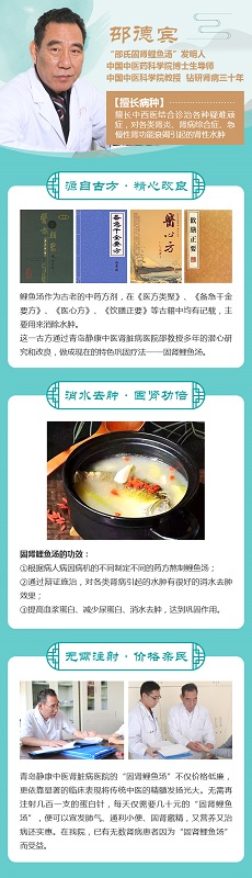 鉴于李先生周身高度水肿的情况,我院为他配合使用“邵氏固肾鲤鱼汤”,有针对性地配制药方熬制鲤鱼汤,提高血浆蛋白、减少尿蛋白、消水去肿,达到巩固病情的作用。
