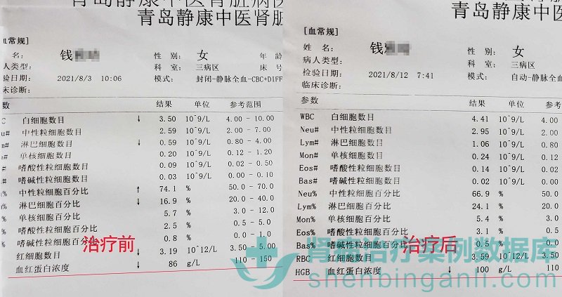 仅一周时间,钱女士的病情便有了起色,不仅周身不适消失,贫血得到纠正,血红蛋白从86g/L升至100g/L,血肌酐从入院时740.5umol/L降至644.4umol/L,远离了透析指标,目前,她的后续治疗还在持续跟进中。