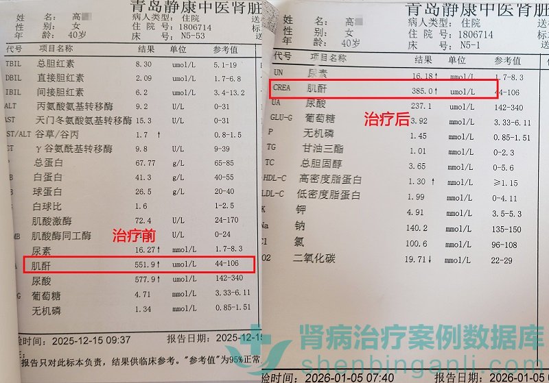 经过短短20天的系统治疗,疗效令人鼓舞: 高女士的恶心、水肿、乏力等症状显著改善,复查显示,她的血肌酐水平从551.9umol/L显著降至385umol/L,其他关键指标也同步向好。这一变化让她成功远离了当前必须透析的危险临界线,为后续的长期稳定治疗赢得了宝贵的时间和机会。